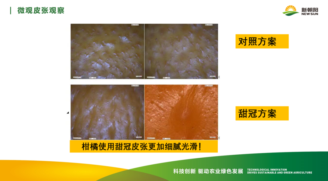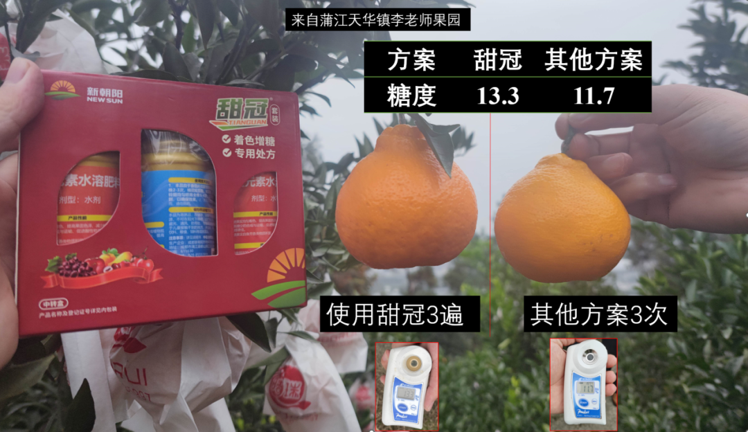 甜冠(冠菌素)適用于各類柑橘品種,如愛媛、金秋砂糖橘、砂糖橘、冰糖橙、金桔、沃柑、耙耙柑、不知火等。促進果實轉色、顏色紅潤,表皮靚麗,提升干物質積累,如提升糖度、芳香味物質積累,提高果實品質,提前上市,提升抗逆性,延長果實留樹保鮮和果實貨架期,減少流通環節損耗。